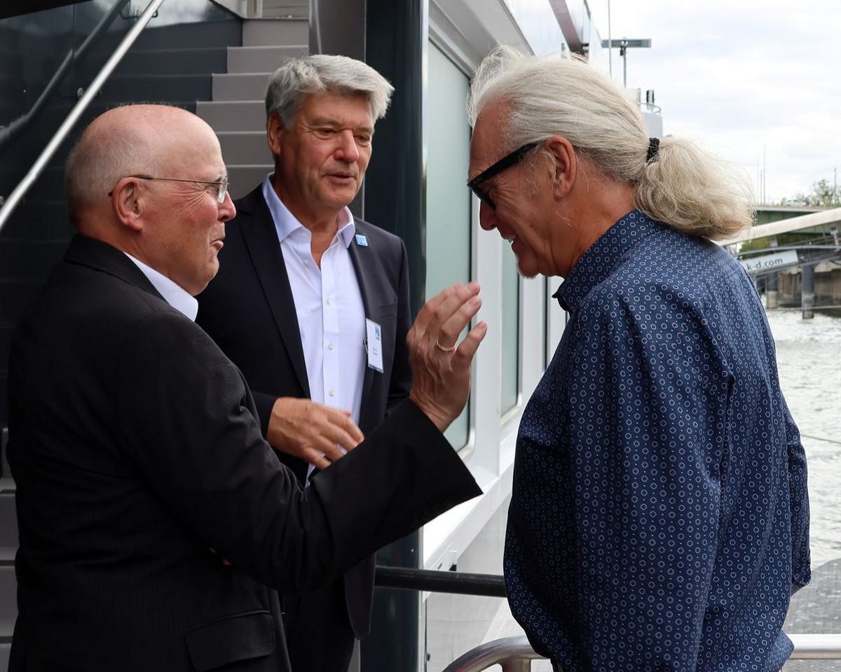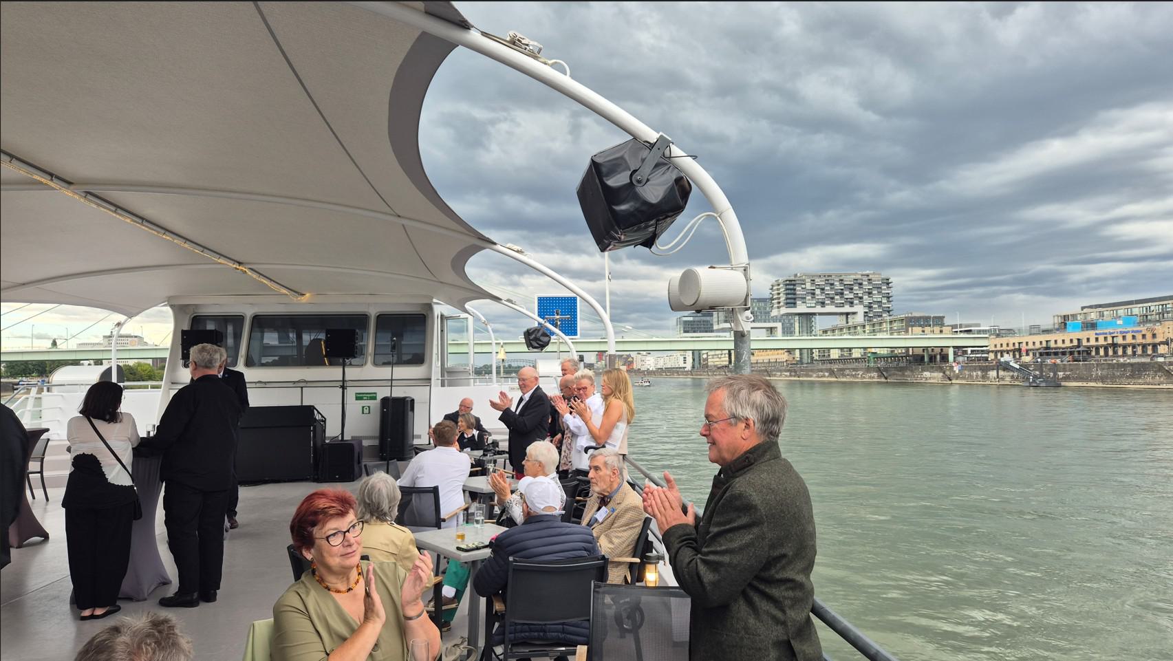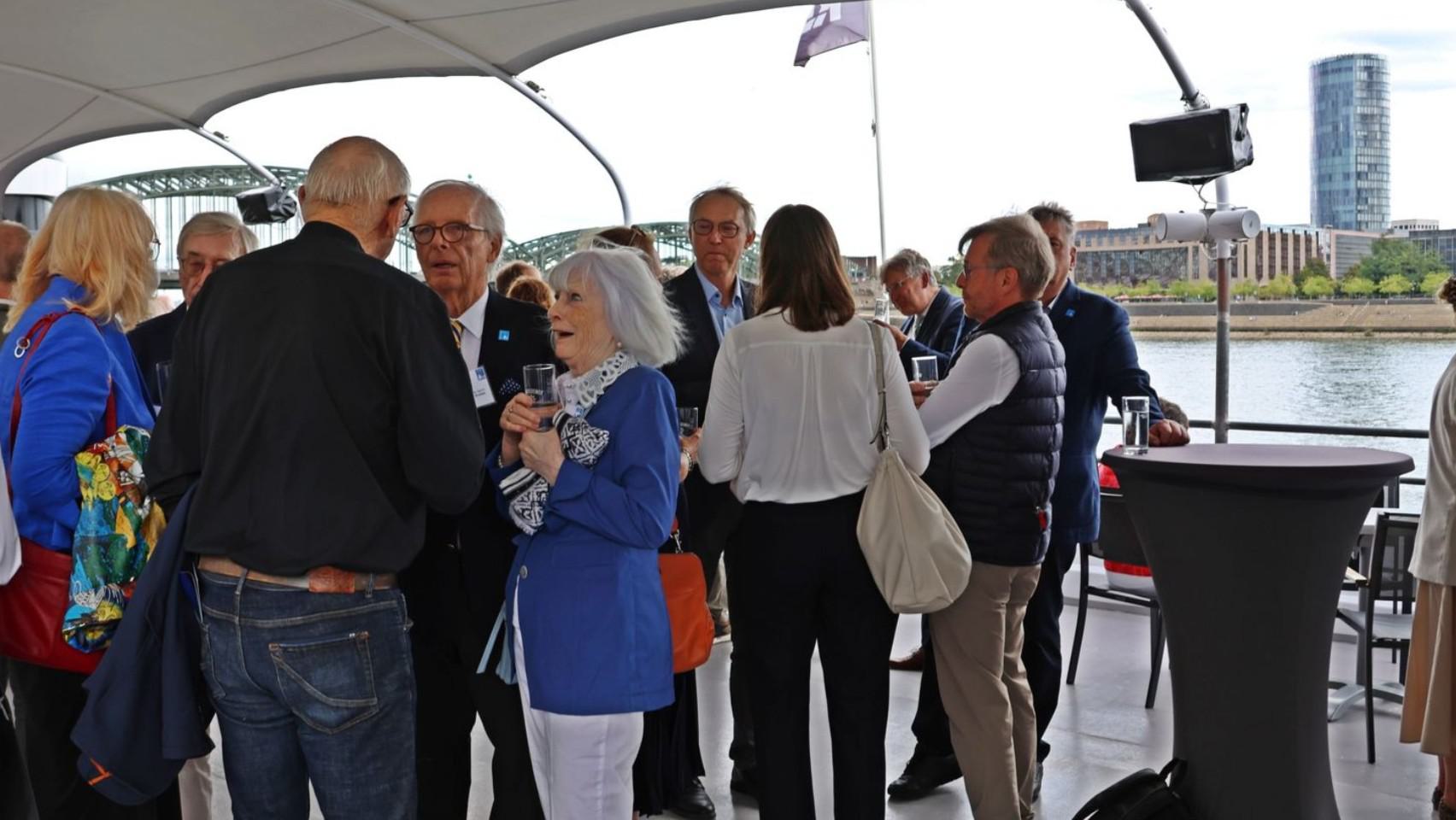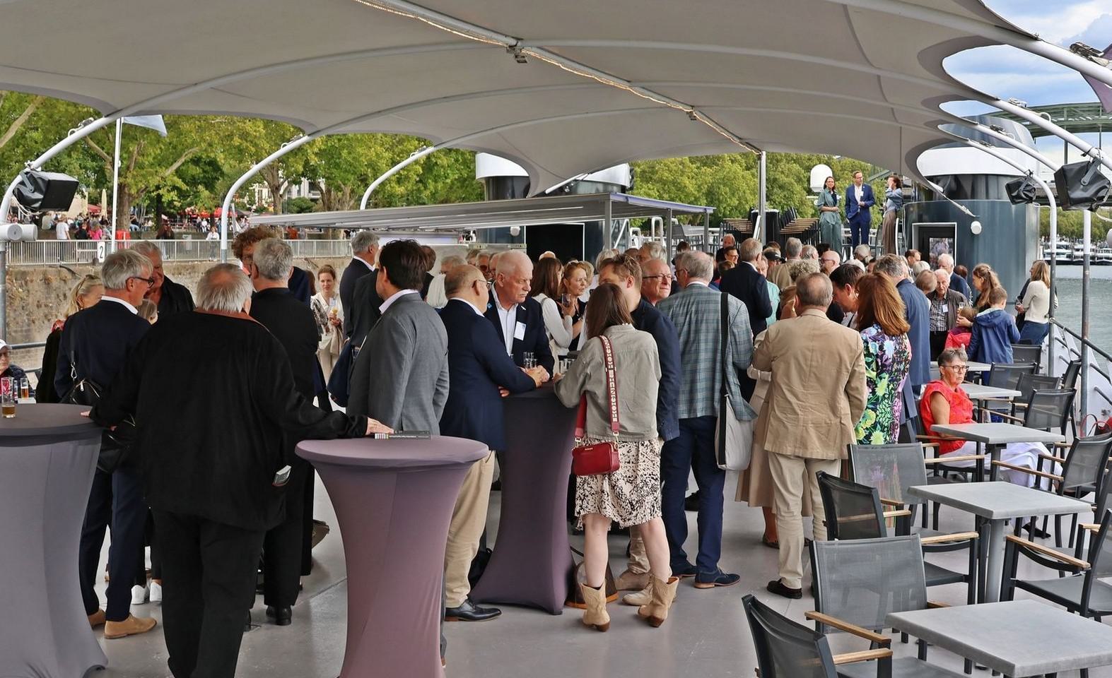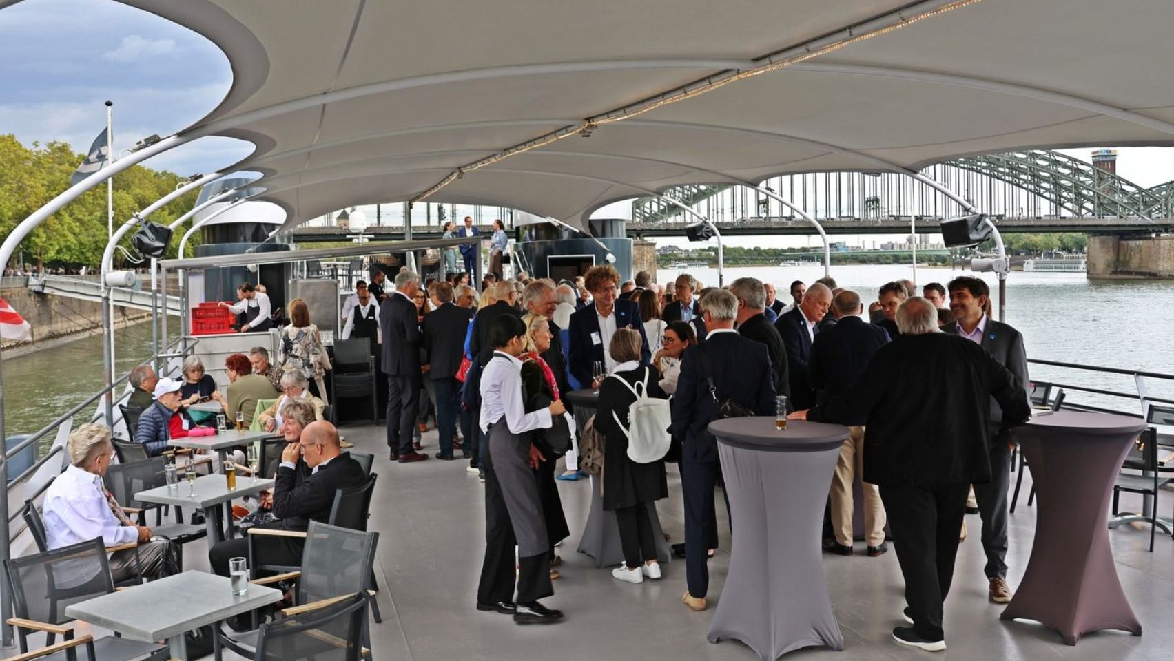 Nach letzten Vorbereitungen und dem Empfang der Gäste startete die Veranstaltung bei einem ersten Getränk an Deck mit den Eröffnungsreden u.a. des Vereinsvorsitzenden Dipl. Ing. Bernd Oxen und des Bürgermeisters Dr. Ralf Heinen als Stellvertreter der Oberbürgermeisterin Henriette Reker.